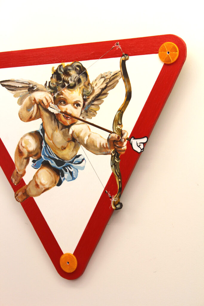 En Cupidos y señales, inspirada en el arte renacentista de mis viajes a Sicilia, transformo el sentido crítico en un mensaje optimista. La yuxtaposición entre señales, asociadas a advertencias, y cupidos, símbolos del amor, genera una tensión visual y conceptual que invita a la reflexión, recordándonos que el amor puede superar cualquier obstáculo.