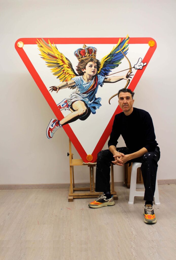 Con Arte para Lovers, mi obra más reciente e inspirada en el arte renacentista, doy un giro al sentido crítico para lanzar un mensaje optimista y esperanzador al mundo. Las señales, elementos cotidianos y a menudo asociados con indicaciones o advertencias, se contraponen de manera sorprendente con la imagen de cupido, símbolo universal del Amor y el Deseo. Esta yuxtaposición crea una tensión visual y conceptual que invita a la reflexión y nos recuerda que el Amor es una fuerza poderosa capaz de superar cualquier obstáculo.