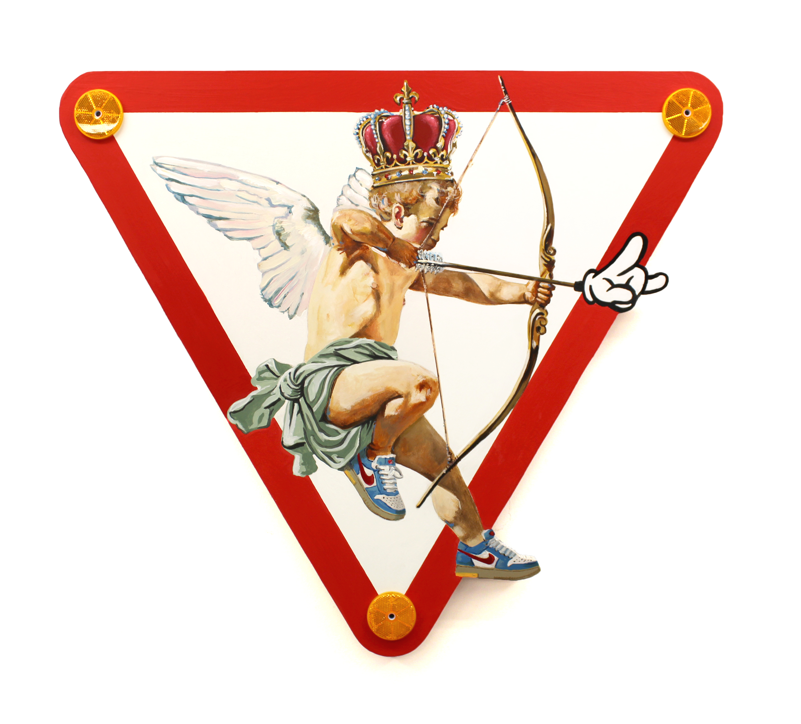 En Cupidos y señales, inspirada en el arte renacentista de mis viajes a Sicilia, transformo el sentido crítico en un mensaje optimista. La yuxtaposición entre señales, asociadas a advertencias, y cupidos, símbolos del amor, genera una tensión visual y conceptual que invita a la reflexión, recordándonos que el amor puede superar cualquier obstáculo.